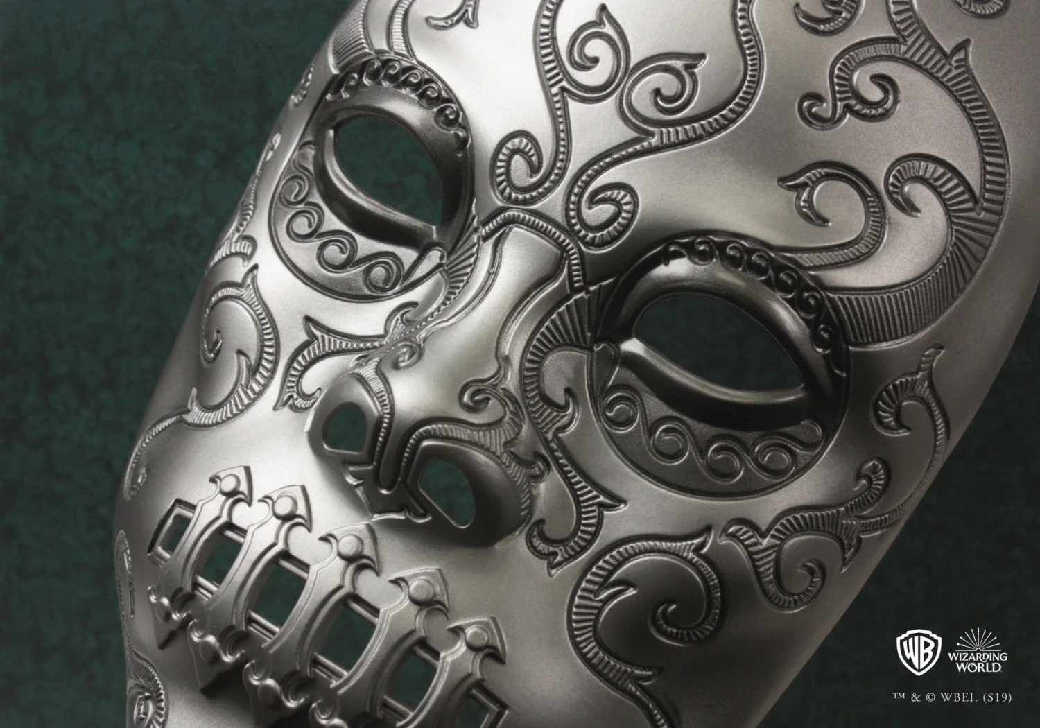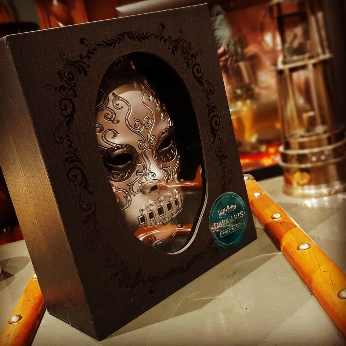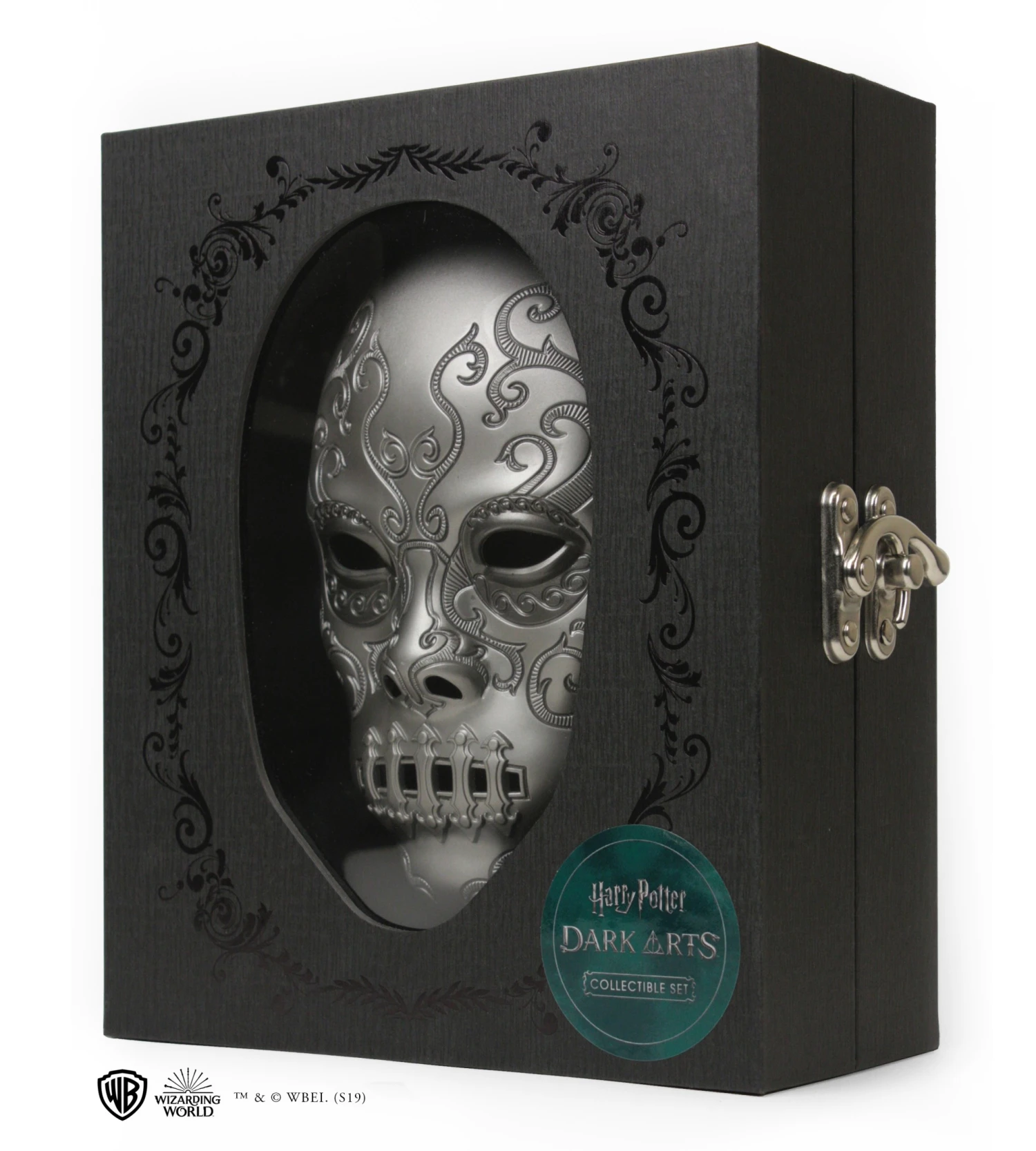 - Un coffret souvenir avec masque de Mangemort de Bellatrix Lestrange moulé et intégré dans la partie supérieure, fermoir chromé. Remarque : le masque mesure env. 10 x 18 cm et bien qu’il soit amovible de la boîte, il n’est pas destiné à être porté.