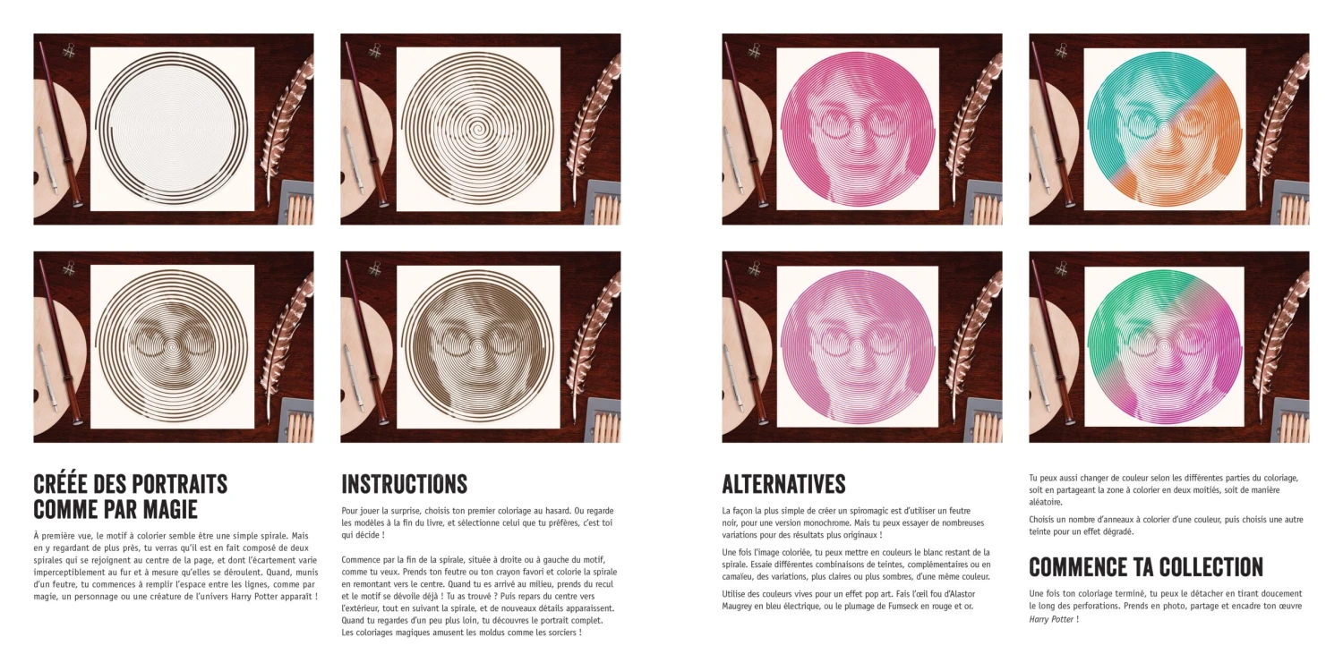 Harry, Hermione, Dumbledore, Dobby⊠et mĂȘme lâinfĂąme Mage noir, tous tes personnages prĂ©fĂ©rĂ©s vont apparaĂźtre petit Ă petit pour former de magnifiques portraits. Des spirales ensorcelantes !