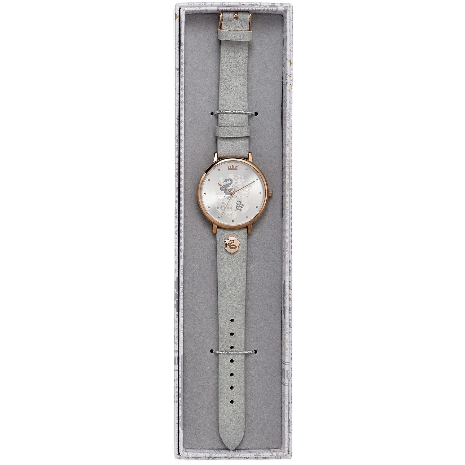 La montre porte l’écusson de la maison Serpentard sur le cadran et d’autres détails de la maison sur le bracelet en cuir.