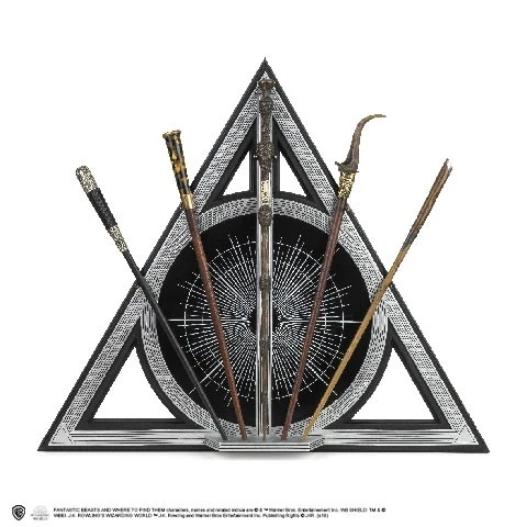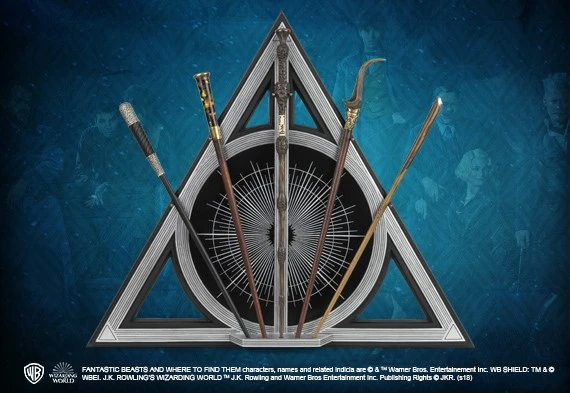 Ce présentoir à baguettes représente le symbole des Reliques de la Mort. Fabriqué en résine, il mesure environ 38 cm de hauteur et 35,5 de largeur. Il se compose des baguettes magiques de 5 personnages incontournables dans Les Animaux Fantastiques – Les Crimes de Grindelwald (de gauche à droite sur la photo) :
